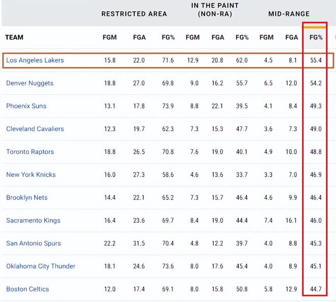 湖人在本赛季迎来了巨大变化,其中一个环节是他们的中投能力大幅提升了。湖人变成了王牌中投强队,截至11月5日,湖人的中投命中率55.4%排名全联盟第一。东契奇、艾顿、八村垒和里夫斯的中投命中率都很高,占据联盟中投命中率榜前十的4个位置。