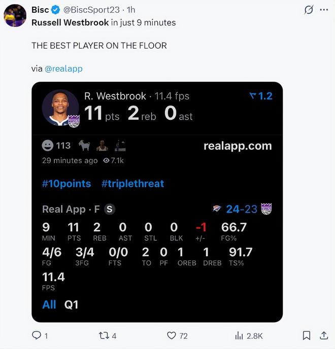 北京时间11月8日,国王不敌雷霆无缘连胜。但这场比赛拿着底薪363万合同的拉塞尔-威斯布鲁克再度贡献了一场华丽的表演,全场比赛24分9助攻6篮板7失误5记三分。