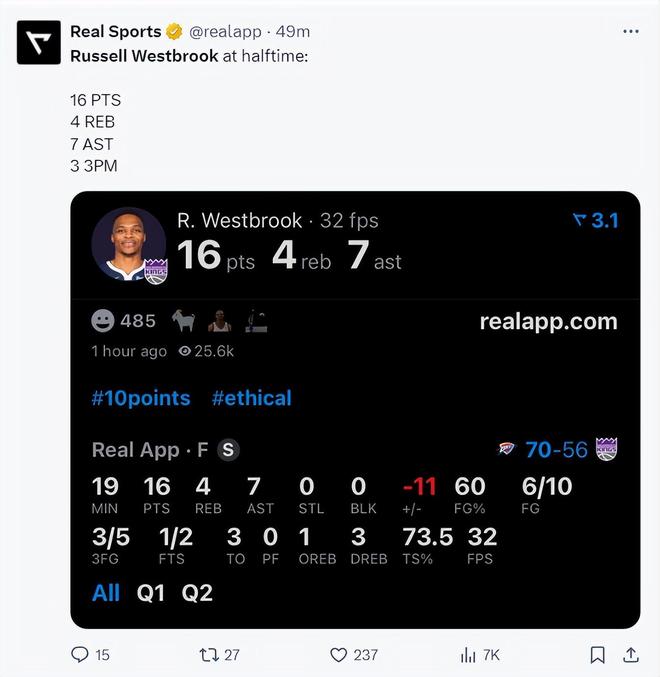上半场打完19分钟里,威少10中6,三分5中3,拿到16分7助攻4篮板,真实命中率73.5%,只可惜面对强大的雷霆还是无法帮助球队缩小分差。