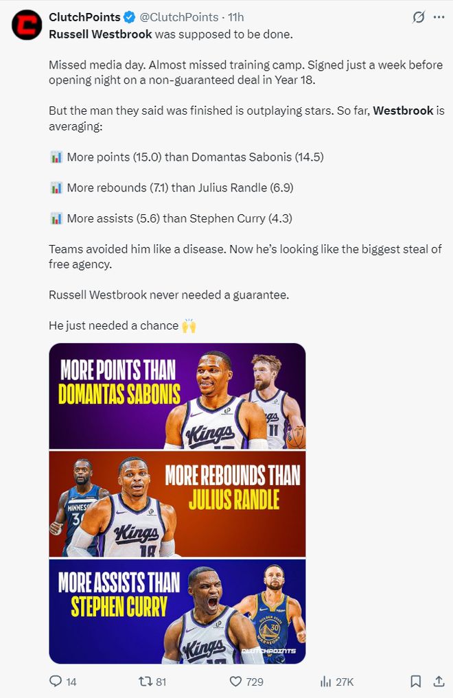 赛前美媒Clutchpoints写道:威少本该就此退役,错过了媒体日、错过了训练营,开赛前一周才签下一份无保障底薪。