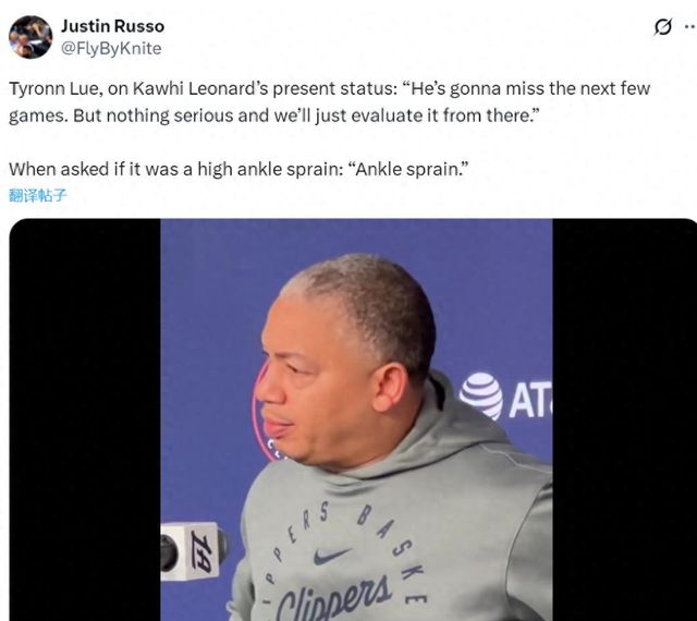 伦纳德脚踝扭伤,未来几场不会出战,归期未定。