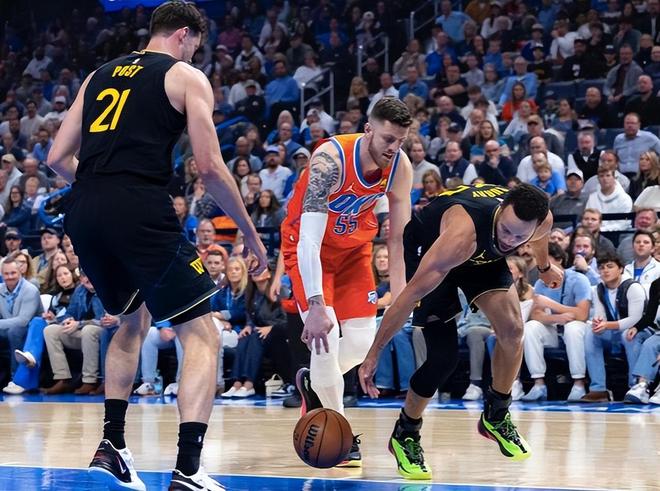 相比勇士,如今这支雷霆队的战术以及得分强点的发挥都要更好,即便亚历山大在轮换时间下场休息,雷霆依然能够打出高效的进攻配合。哈腾先是利用身高和脚步过掉戴维斯上篮得分,随后他又在弧顶处持球,助攻空切至篮下的卡鲁索得分。等到亚历山大上场之后,他又与华莱士打成同样的一次配合,雷霆的领先优势已经达到16分。库里的上篮在雷霆的双人包夹下滑筐而出,或许是对于这一次进攻不进的不满,格林在下一回合的防守中拉倒了以赛亚-乔,在裁判吹罚犯规之后表示不满,结果被吹了一次技术犯规。上半场结束,勇士已经落后雷霆19分。