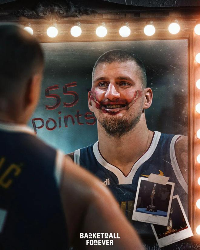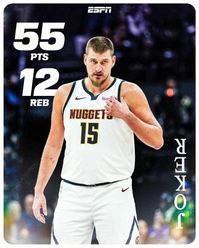 有点可惜的地方在于,第四节因为分差太大,约基奇只打了不到3分钟,最终得分定格在55分。