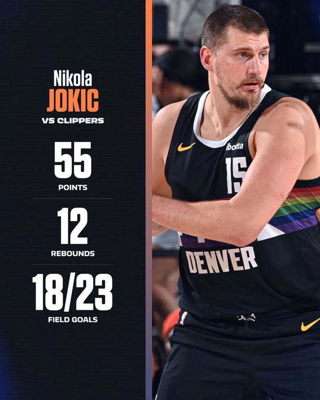 这场比赛,约基奇打出了赛季至今最强个人表现:全场出战33分钟,投篮23中18,三分6中5,罚球16中14,得到55分12篮板6助攻,正负值+28。
