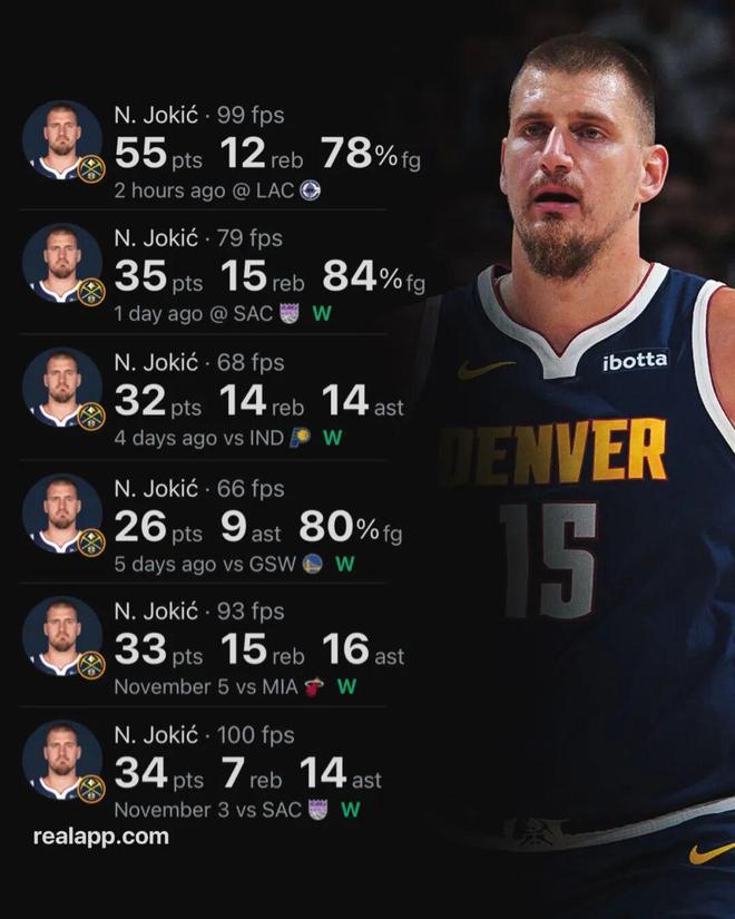 本赛季开局,约基奇相对没有那么炸裂,他在前5场比赛里4次拿下三双,但是没有一场得分超过25分,但是从第六场比赛开始,约基奇又开启了MVP模式。
