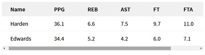 哈登在那个赛季场均出场36.8分钟,而爱德华兹本赛季至今场均仅出场28.4分钟,不过他常规出场时间通常在35-36分钟左右。基于这一情况,我们可以将哈登2018-19赛季的场均数据,与爱德华兹本赛季七场比赛的每36分钟数据进行对比。