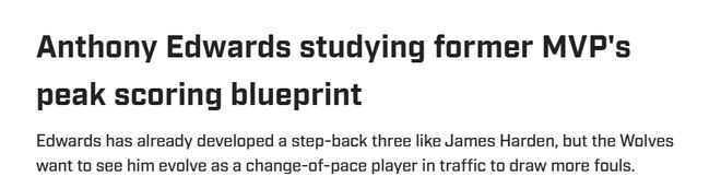 “海恩斯说,他几周前坐下来观看了2018-19赛季詹姆斯-哈登的比赛录像,他们正在研究哈登的节奏、节奏变化、变向技巧以及制造犯规的能力。森林狼队的教练组认为,如果爱德华兹能多站上几次罚球线——最好能达到亚历山大的水准,那么不仅他个人的上限会提升,整支球队的上限也会随之提高,”琼斯说道。