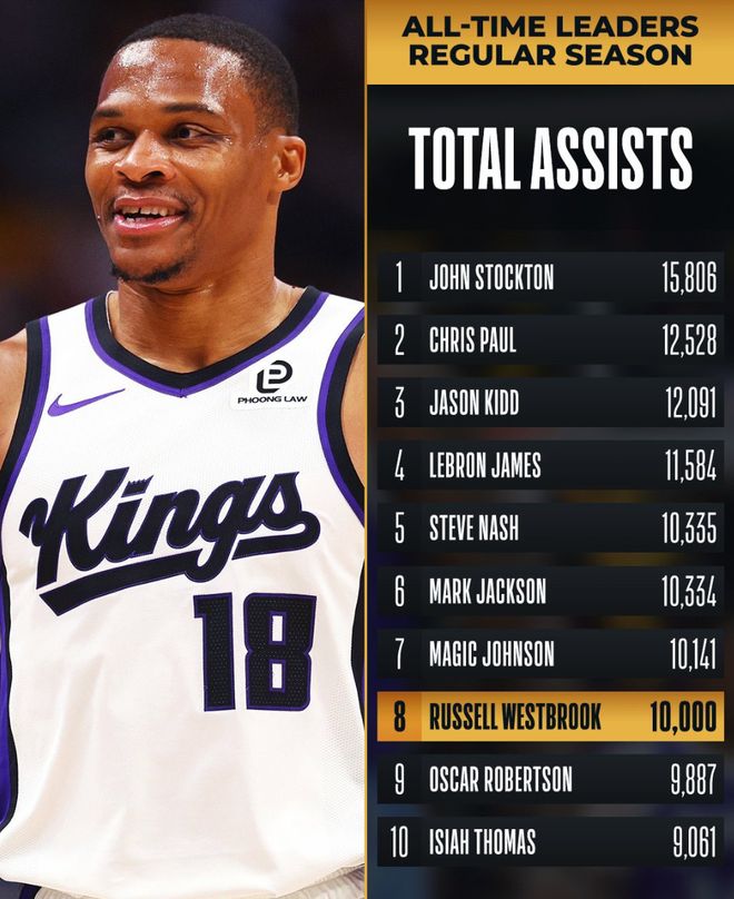 国王不敌森林狼,这场比赛拉塞尔-威斯布鲁克顶替了丹尼斯-施罗德的先发控卫席位,他完成了个人10000助攻的里程碑,虽然最终国王输球了,但这个夜晚威少绝对是整个NBA最吸睛、最闪耀的那个人。