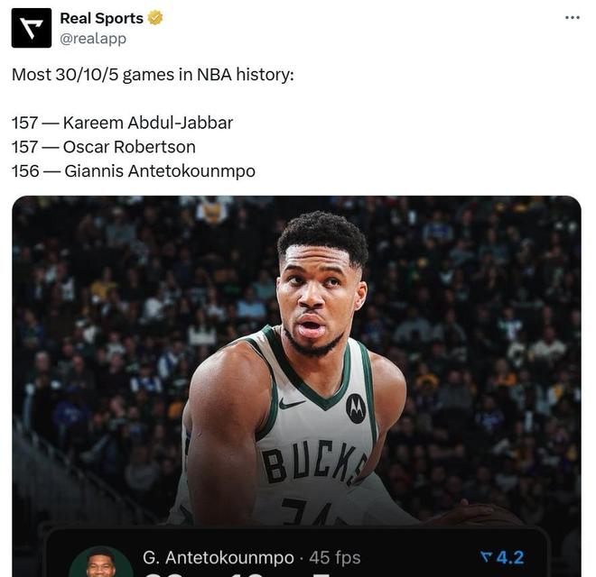 凭借这样的表现,字母哥生涯至今已经第156次单场至少轰下30分10篮板5助攻全能数据,高居NBA历史第二,仅次于贾巴尔与大O并列第一的157次。