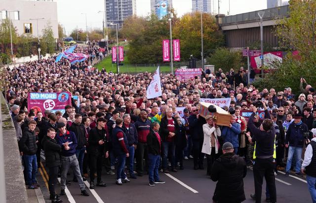 据《太阳报》报道,在西汉姆主场对阵伯恩利赛前,上千名西汉姆联球迷举行激烈抗议游行,前排球迷抬着棺材走向球场,这已经是西汉姆连续第三个主场比赛出现球迷抗议活动。